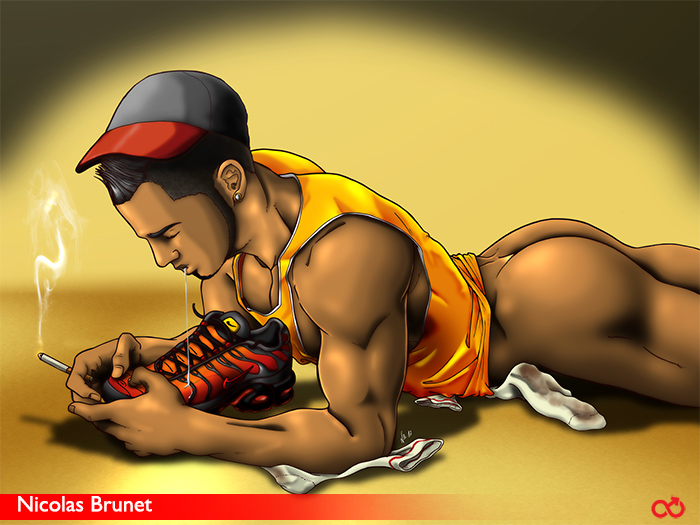 If you’re speaking of my motivations for drawing, they’re none apart to my own pleasure, and if it pleases other people it’s even better. It might sound a bit selfish, but I don’t do good things when I force myself to draw things I don’t want to. I’m drawing with instinctive feelings. But it’s funny to look and observe what people like (or at least seem to like) through Tumblr for example, what kind of fetishes or type of guys. That’s great for me, I’m curious and like many type of guys and fetishisms to draw. So I said to myself, for example: “Hey some like to sniff sneakers, why not try to draw that?” It forces me to be careful at all the codes there are for each type of fetish.